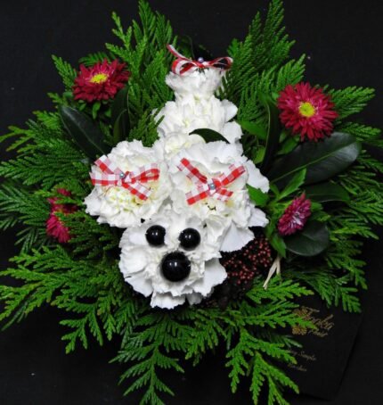 Illuminate remembrance with our 40″ Spray – a towering arrangement of golden yellow roses, pure white lilies, soft white hydrangeas, and delicate white stock, framed by lush tropical greenery. This majestic standing spray rises with dignity and warmth, honoring life with timeless beauty.