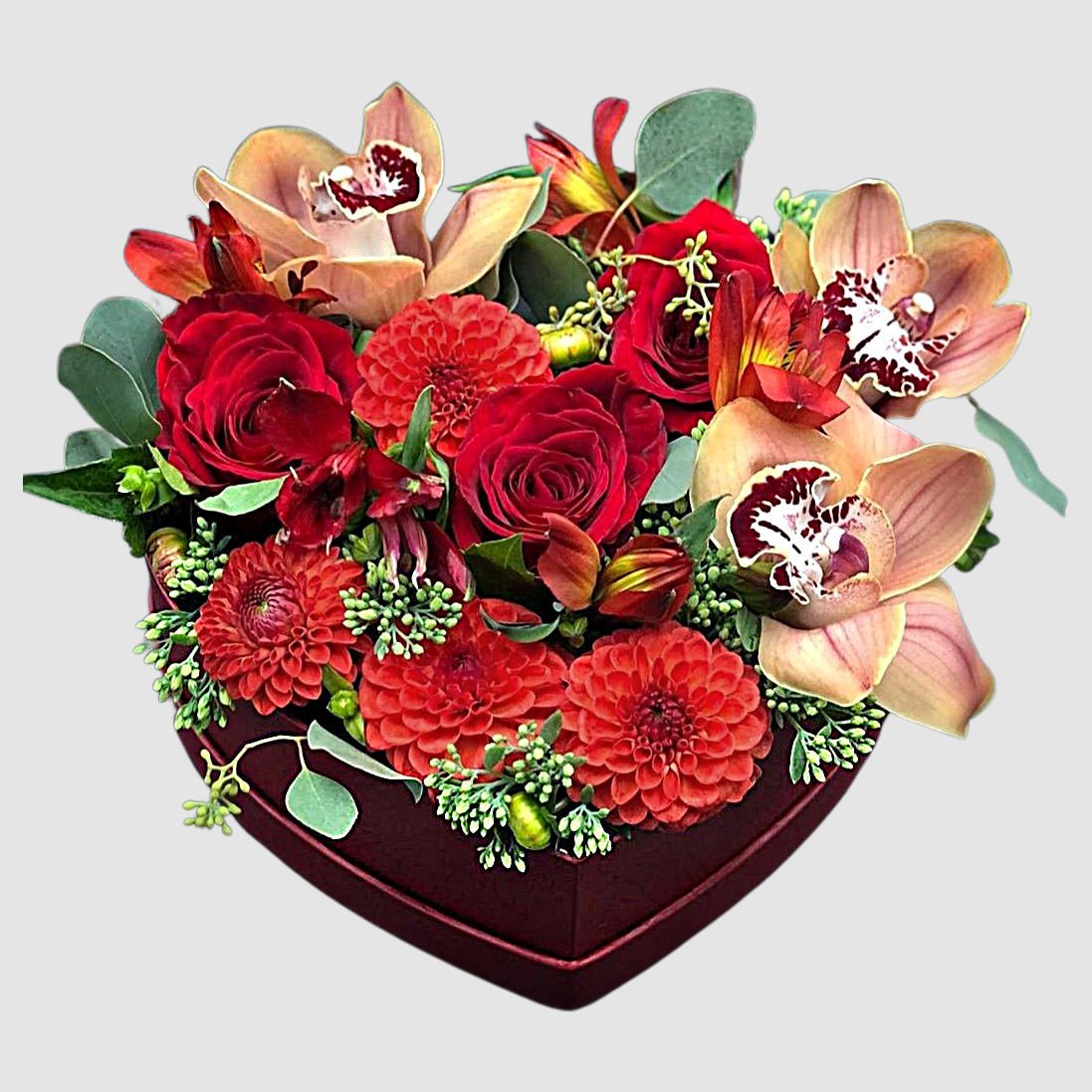 This Beautiful Heart Shape Box Featuring Dahlia, Rose, Orchid, Sedum, Alstroemeria and Eucalyptus.