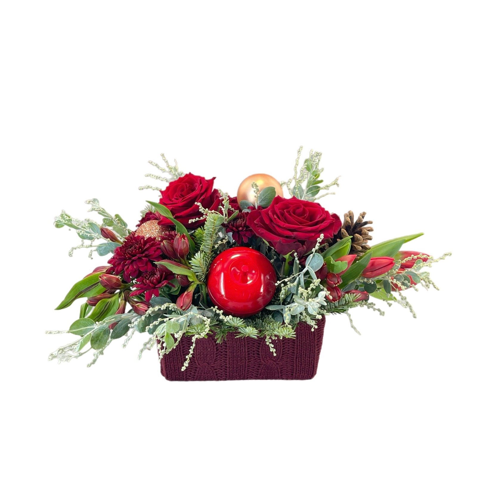 Bursting holiday spirit is elegantly symbolized in this deep red bouquet, where Red Roses, Alstroemeria ,Tulips ,spray mums , holiday greenery ,pine cone and Christmas ornaments explode a red cable knit fabric pot featured Scented Winter apples & apple shaped  candle