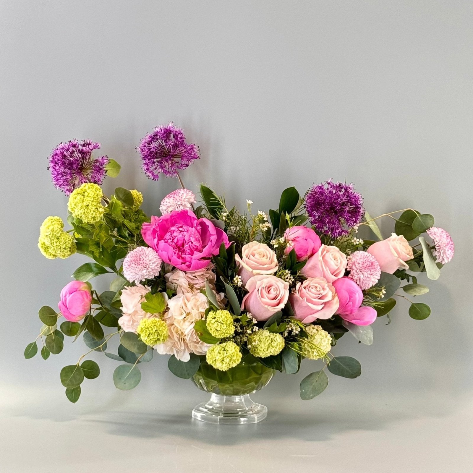 Includes: Pink Peonies, Light Pink Roses, Lavender Allium, Green Viburnum, Soft Chrysanthemums, Fresh Eucalyptus