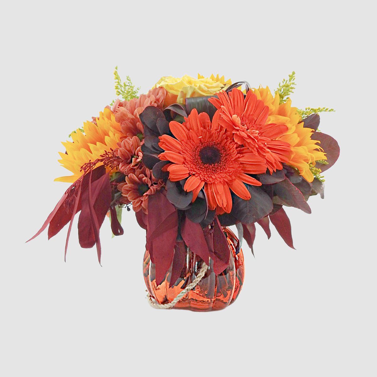 This cheerful celebration of fall is perfect for gifting! Sitting in a charming glass pumpkin this arrangement bursts with orange, yellow and red blooms and foliage!