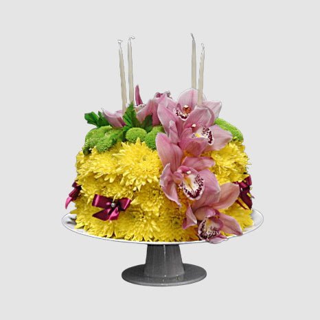 Our vibrant flower cake has all the ingredients for a happy celebration. This confection-inspired creation is the perfect centerpiece for any birthday party. This stunning cake-shaped floral arrangement with pink and white carnations, pink cymbidium orchid and candles is sure to delight. This arrangement arrives on a raised white plate and wrapped in clear cellophane tied with a satin ribbon. Our florists hand-design each arrangement, so colors and varieties may vary due to local availability. Low carb and Gluten-free.