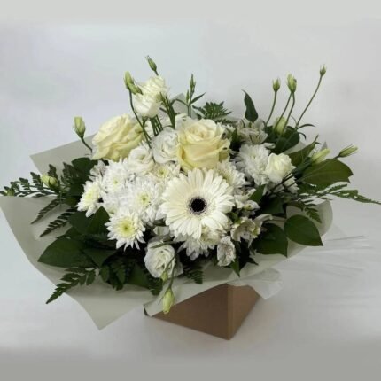 Offer a serene and elegant tribute with the Heavenly Grace Vase Arrangement – a peaceful bouquet featuring premium fresh flowers, including white lilies, roses, orchids, chrysanthemums, and lush green foliage, all beautifully arranged in a classic white vase. This graceful display radiates purity and tranquility, perfect for funerals, memorial services, or expressing heartfelt sympathies.