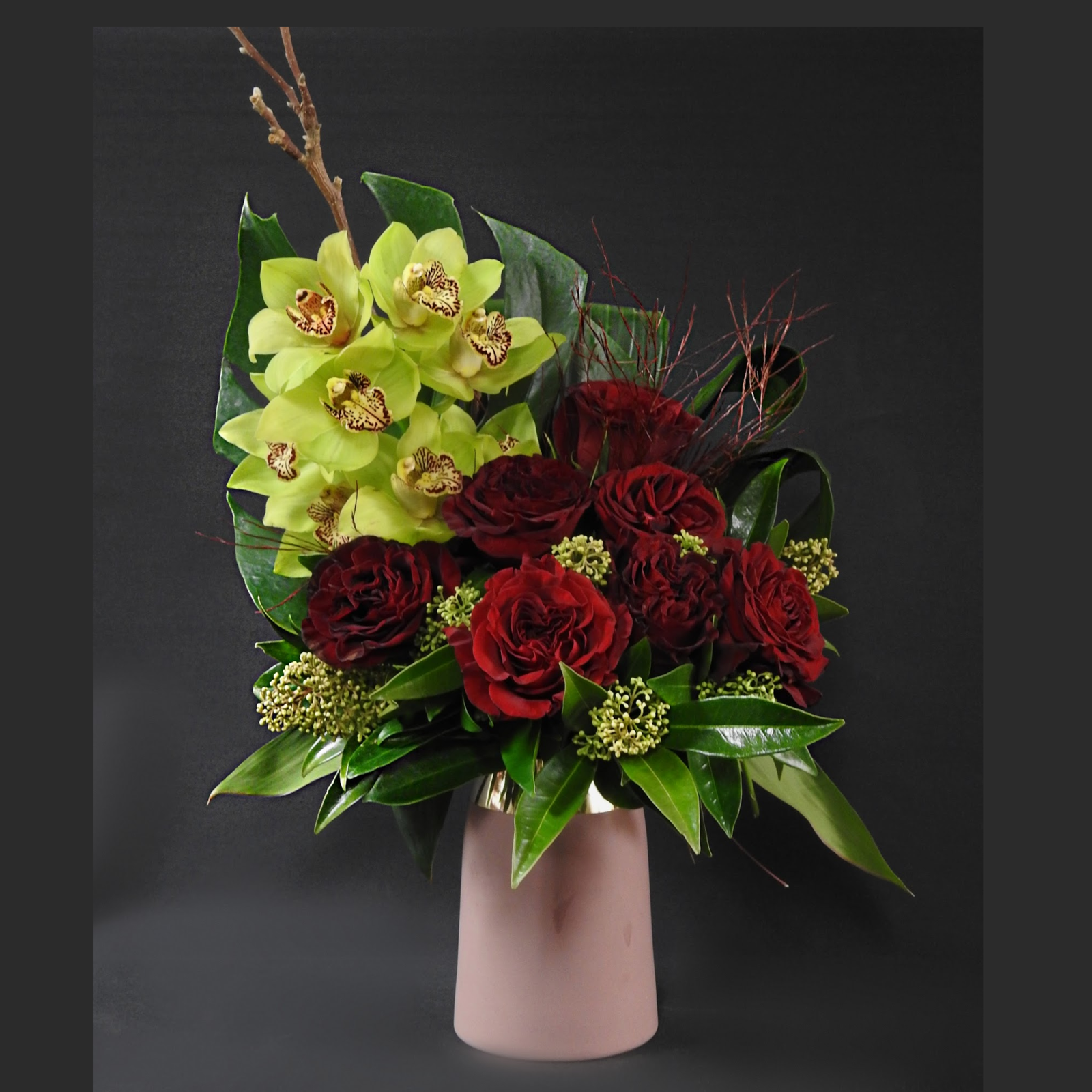 This breathtaking design is as elegant as it is romantic. this stunning arrangement featuring rose, cymbidium orchid, skimmia and decorated with tropical leaves resting in 8″ ceramic pot.