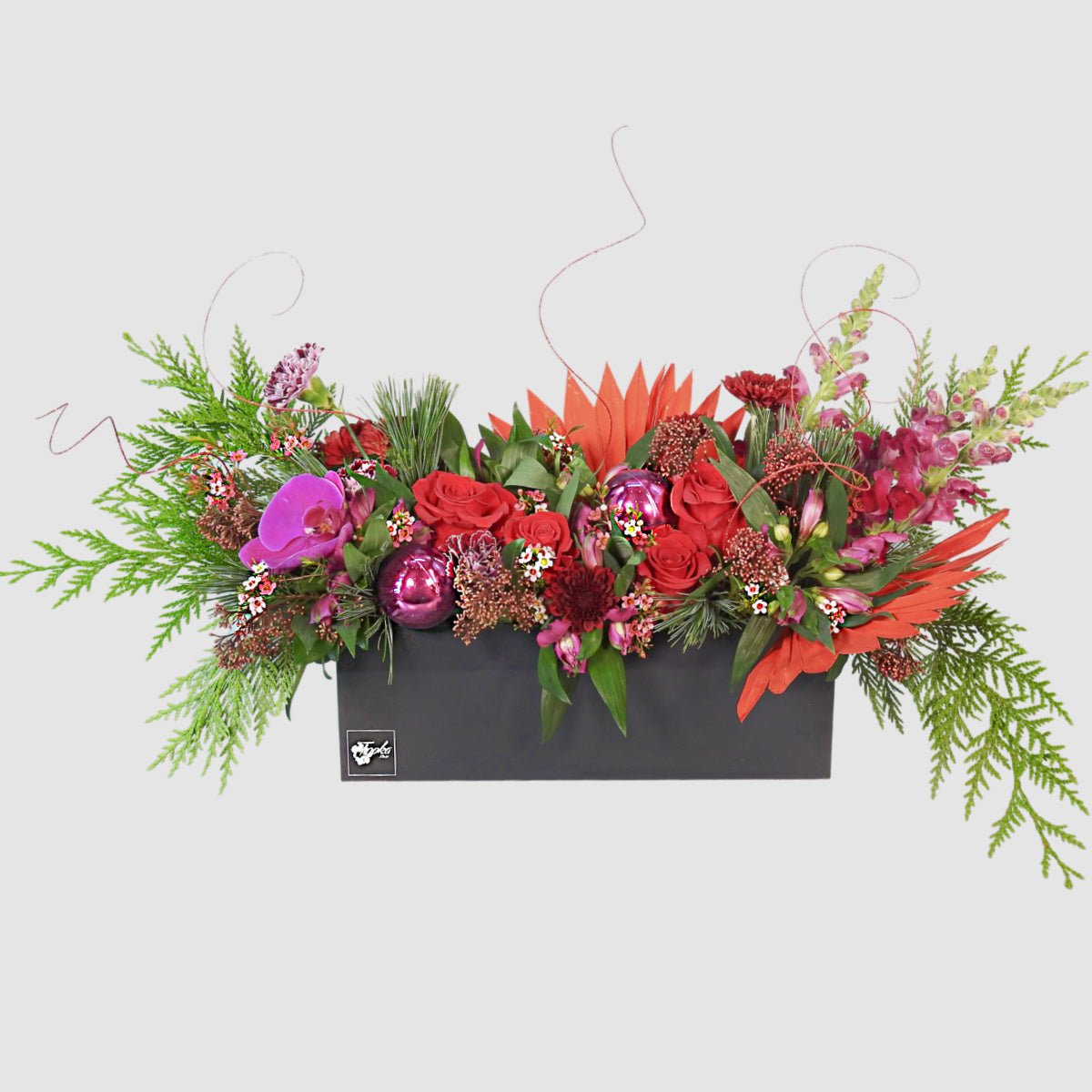 Traditional festive arrangement in jewel tones color palette with a modern twist, featuring trendy dried floral elements, lush blooms, fragrant evergreens and beautiful ornaments.