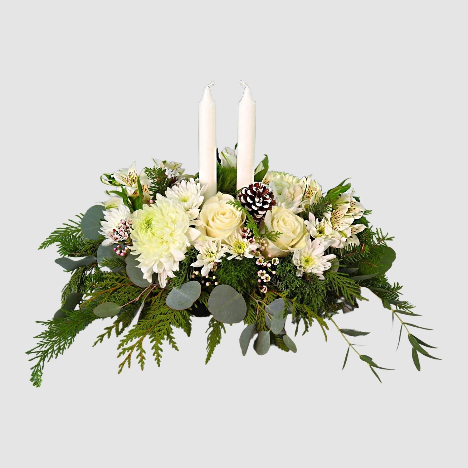 Let this elegant white and cream centerpiece elevate your table or mantlepiece this holiday season. This stunning display features premium roses, beautiful spray chrysanthemums and soft white wax flowers resting on a bed of fresh local evergreen boughs. We use local pinecones to finish this sophisticated arrangement.