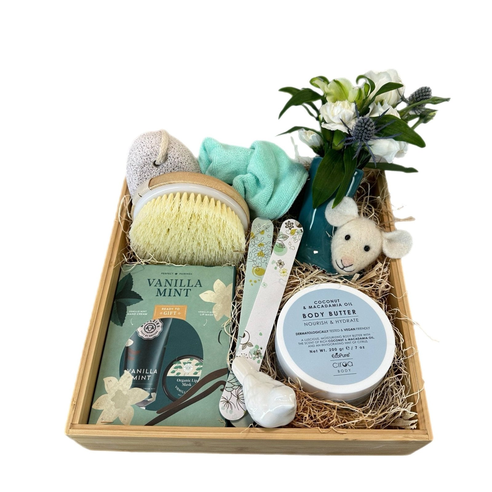 Indulge her senses with our Spa Gift Box for Her – a curated collection of vanilla-mint body butter, exfoliating pumice stone, soft bath sponge, and coconut oil hand cream, paired with a delicate mini bouquet of white blooms and blue thistle. Nestled in a natural wooden tray with plush lamb plush and manicure essentials, this set wraps self-care in thoughtful elegance.