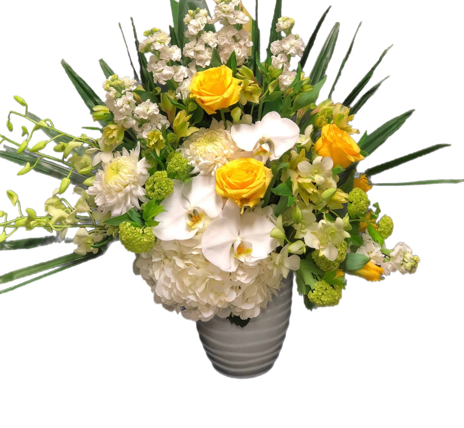 This gorgeous flower arrangement is reached with cheery yellow roses that are sure to bring sunshine. A fabulous arrangement of white stocks with viburnum , mums , Hydrangea ,orchids and tropical greens