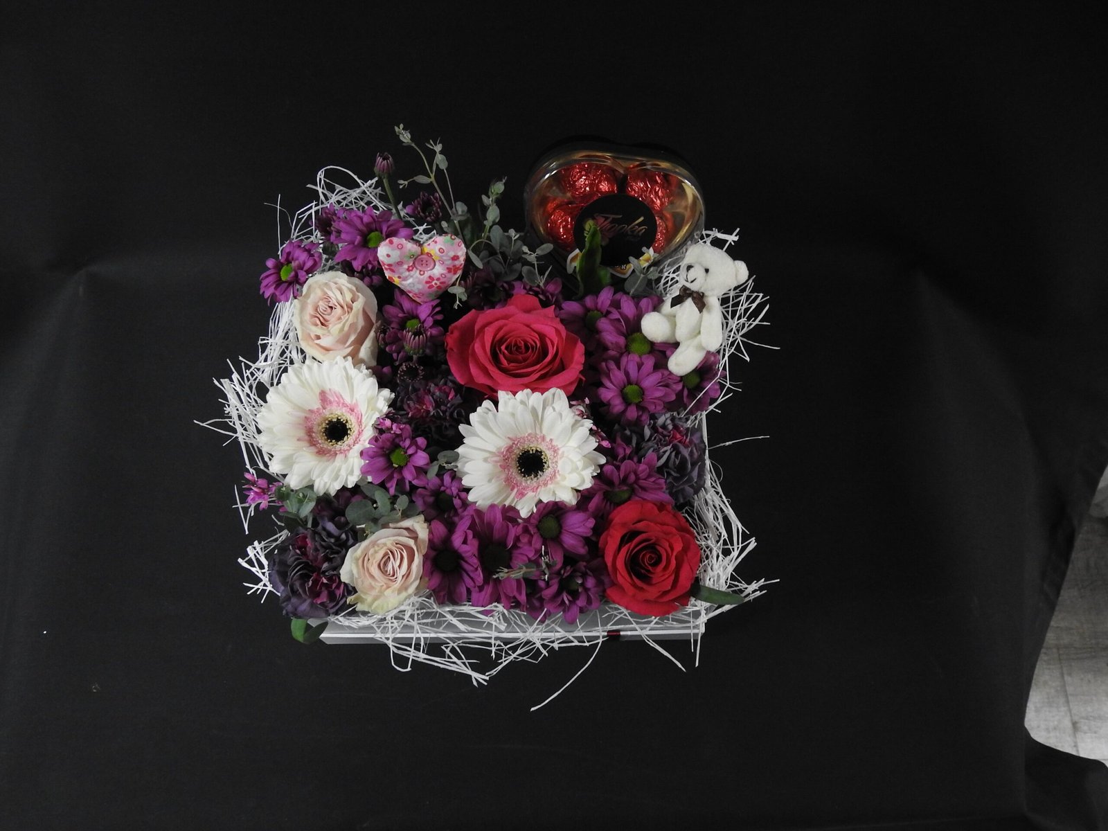 Two shades of pink roses ,carnation, spray mum, skimmia, chocolate, mini teddy bear and decorative heart rest gracefully in 12″ x 12″ x 8″ H white box