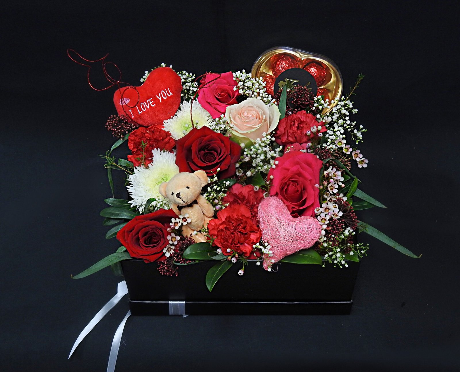 This beautiful Valentine’s Box featuring rose, carnation, mum, skimmia, chocolate, mini teddy bear and more.